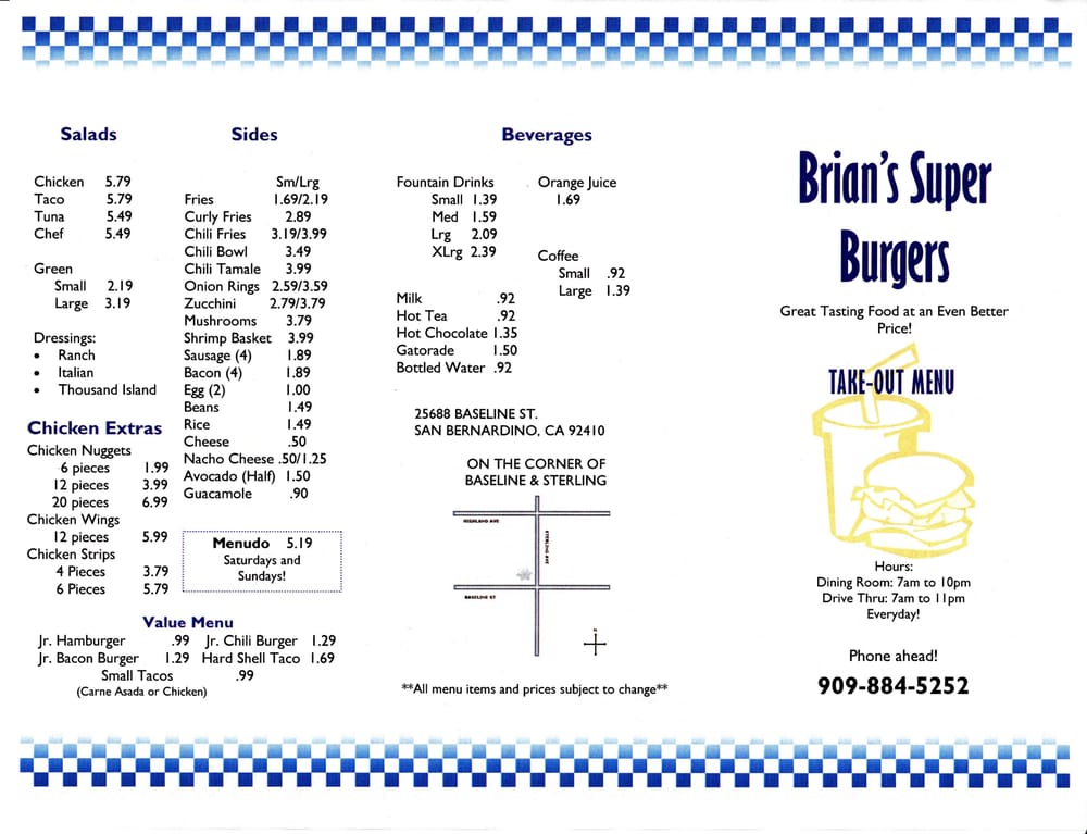 Tucked away in San Bernardino, CA, Brian's Super Burger is a must-try for burger enthusiasts. This casual eatery offers a wide range of options, including delicious burgers, sandwiches, and Mexican dishes. Whether you're looking to dine in or take out, Brian's Super Burger has you covered with their convenient services like delivery and catering. The menu caters to all tastes, making it a perfect spot for groups, families, or individuals. With private parking, outdoor seating, and Wi-Fi available, the restaurant ensures a comfortable dining experience. Don't forget to try their signature burgers and sandwiches, which are sure to impress with their unique flavors and generous portions. Overall, Brian's Super Burger is a great choice for any meal of the day, from brunch to dinner.